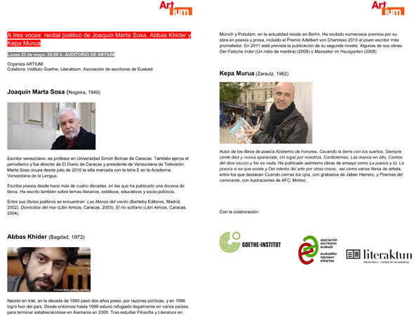 El próximo 23 de mayo, a las ocho de la tarde, los poetas Kepa Murua, Abbas Khider y Joaquín Marta Sosa participarán en un recital titulado 'A tres voces' que se celebrará a las 20:00 horas en el Auditorio de Artium y en el que colabora la Asociación de Escritores de Euskadi/Euskadiko Idazleen Elkartea (AEE/EIE). Podéis descargaros la información pinchando en la imagen.