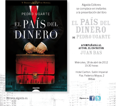 Algaida Editores se complace en invitarles a la presentación del libro EL PAÍS DEL DINERO, de Pedro Ugarte. Acompañará al autor el escritor Juan Bas. Miércoles, 18 de abril de 2012. 19:30 horas. Hotel Carlton. Salón Imperial (Pza. Federico Moyua, 2. Bilbao).