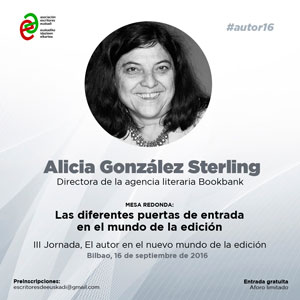La Asociación de Escritores de Euskadi-Euskadiko Idazleen Elkartea (AEE/EIE) continúa anunciando nuevos nombres de ponentes y conferenciantes en la III Jornada 'El autor en el nuevo mundo de la edición', que se celebrará el próximo 16 de septiembre en Bilbao. Alicia González Sterling, directora de la agencia literaria Bookbank, estará en Azkuna Zentroa-La Alhóndiga para ofrecer la visión de los profesionales que intermedian entre el autor y las editoriales.