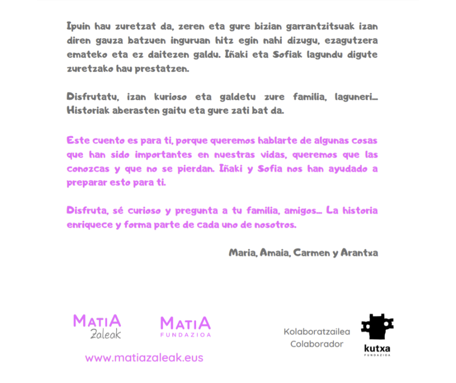 El cuento, los temas tratados en el mismo, son reflejo de la vida de las autoras: Maria, Amaia, Carmen y Arantxa. Lo que en esta ocasión nos han querido transmitir, los puntos importantes en sus vidas, que han dejado huella, que no quieren que se pierdan en el olvido, vidas diferentes, pasados diferentes, pero en un marco similar y uniendo sus vidas y sus recorridos, en un pequeño cuento para niños.