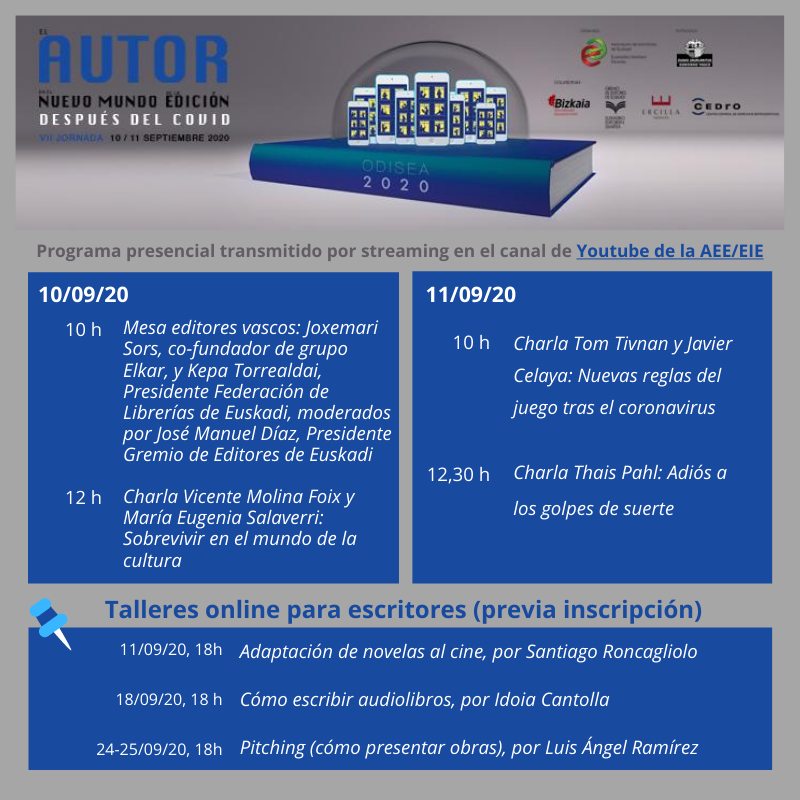 Mañana arrancan las VII Jornadas del Autor que organiza la Asociación de Escritores de Euskadi/Euskadiko Idazleen Elkartea (AEE/EIE), con el apoyo del Departamento de Cultura del Gobierno Vasco y con la colaboración de la Biblioteca Foral de Bizkaia, del Gremio de Editores de Euskadi y de Cedro.