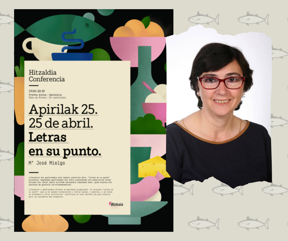 María José Mielgo ofrecerá este jueves 25 de abril, la conferencia "Letras en su punto", en la Biblioteca Foral de Bizkaia (Diputación 7, Bilbao) en donde la literatura y la gastronomía ofrecen un madiraje excepcional. La colección "Letras en su punto" de la editorial Literarte, que ya ha aunado restauración y letras vascas y canarias y en breve se extenderá a otros territorios, constituye en este sentido una guía selecta para los paladares más exigentes.