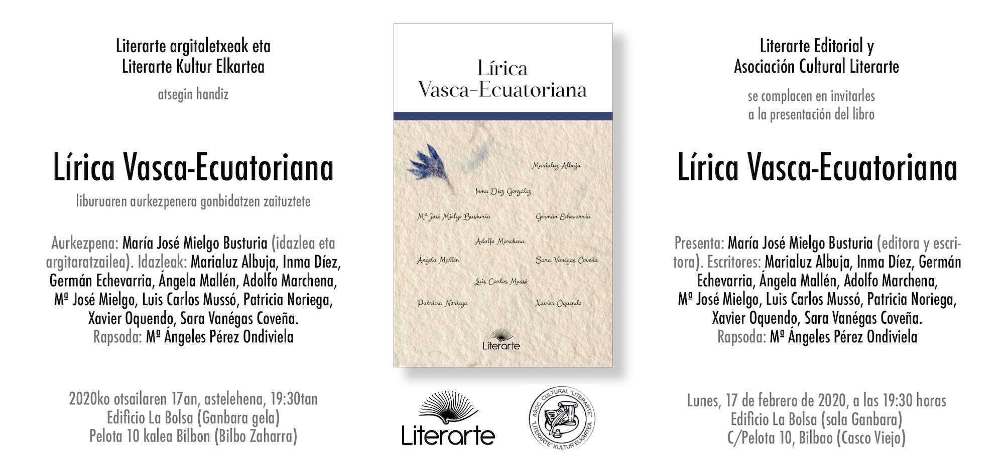 María José Mielgo participará en la presentación de 'Lírica Vasca-Ecuatoriana' que tendrá lugar en la sala Ganbara del edificio La Bolsa (Pelota 10, Bilbao) este próximo lunes 17 de febrero a las 19:30 horas. A la escritora y editora, le acompañarán diversos autores participantes en la antología: cinco poetas vascos y cinco ecuatorianos.
