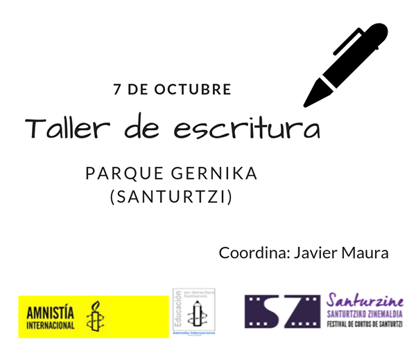 Desde el equipo de educación del grupo local de Amnistía Internacional (AI) Bilbao, junto con el Festival de Cortos de Santurtzi, Santurzine, ha partido la iniciativa “El arte es un arma: creación en vivo”. Se trata de una Jornada Educativa anual abierta al público que este año introduce como novedad un taller de escritura creativa que será coordinado por Javier Maura, el miembro de la Asociación de Escritores de Euskadi/Euskadiko Idazleen Elkartea (AEE/EIE) y activista de AI. Tendrá lugar el próximo domingo, 7 de octubre, en el parque Gernika de Santurtzi.