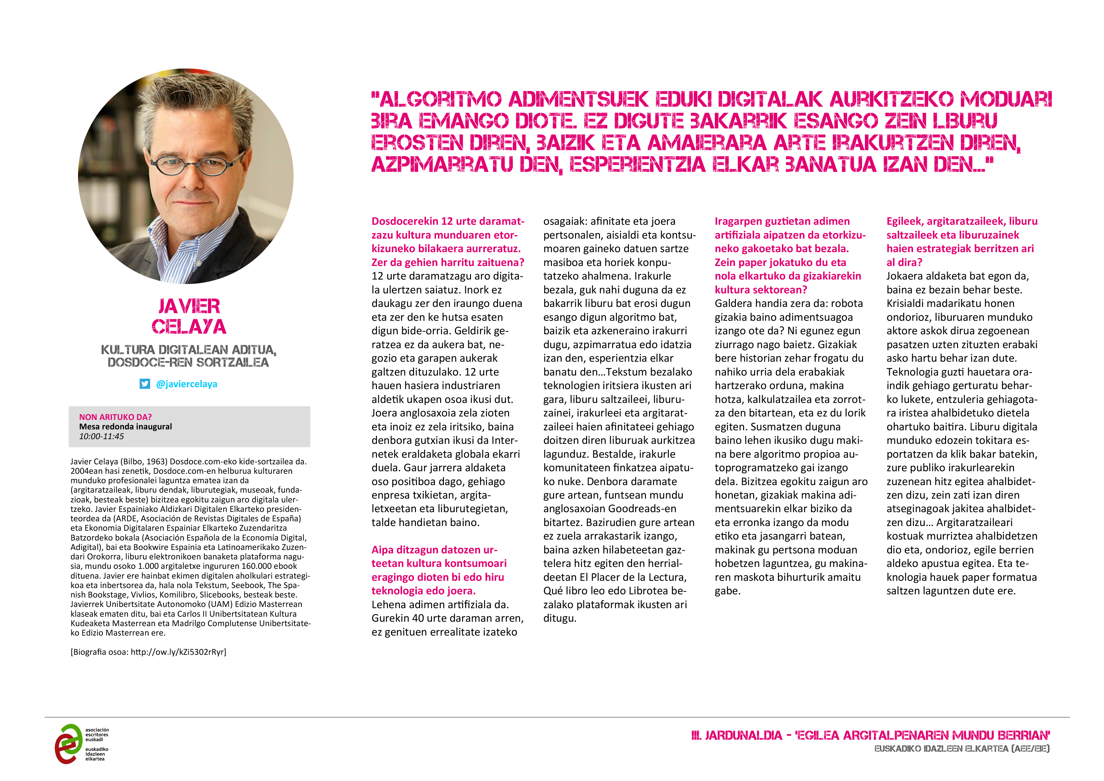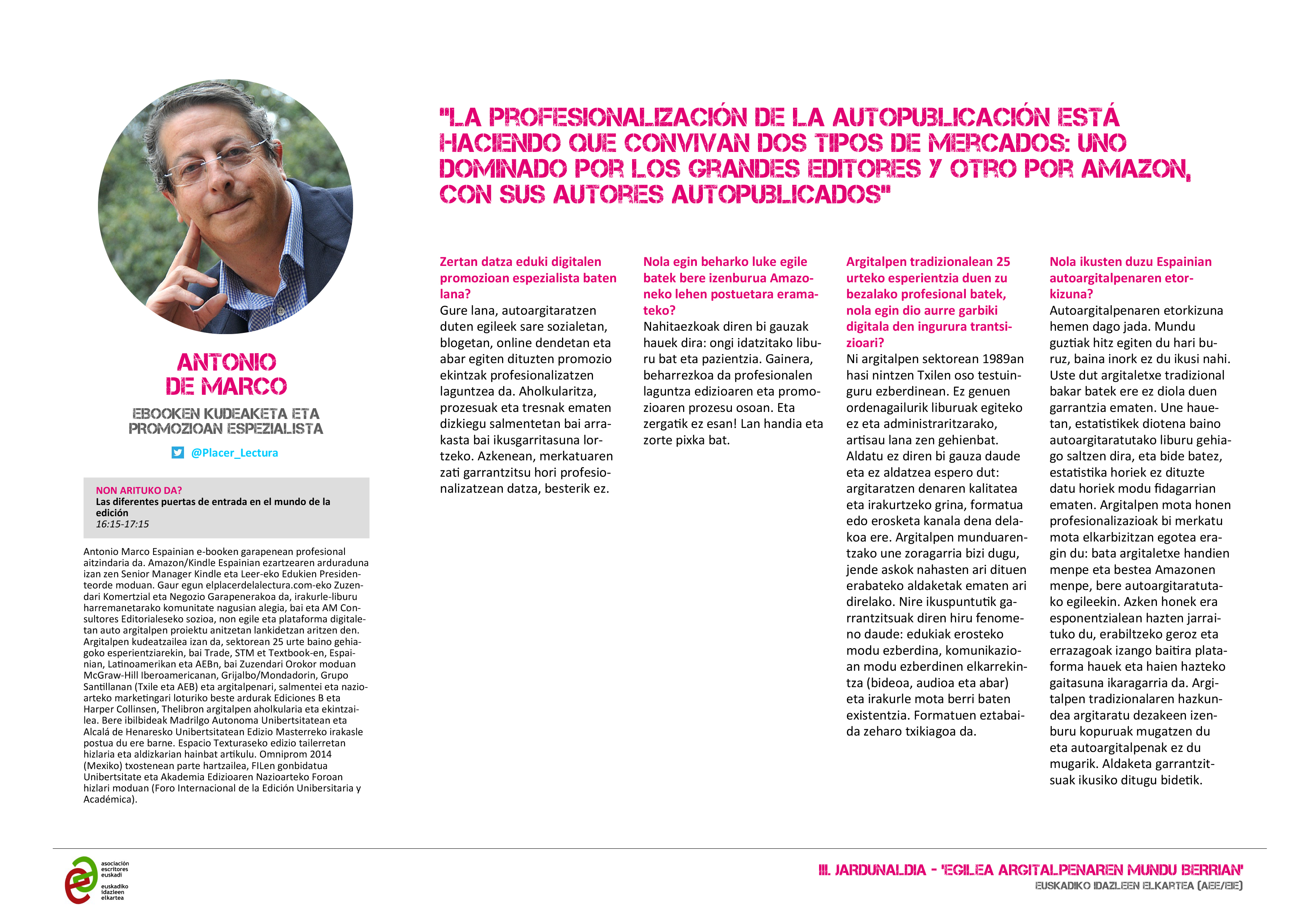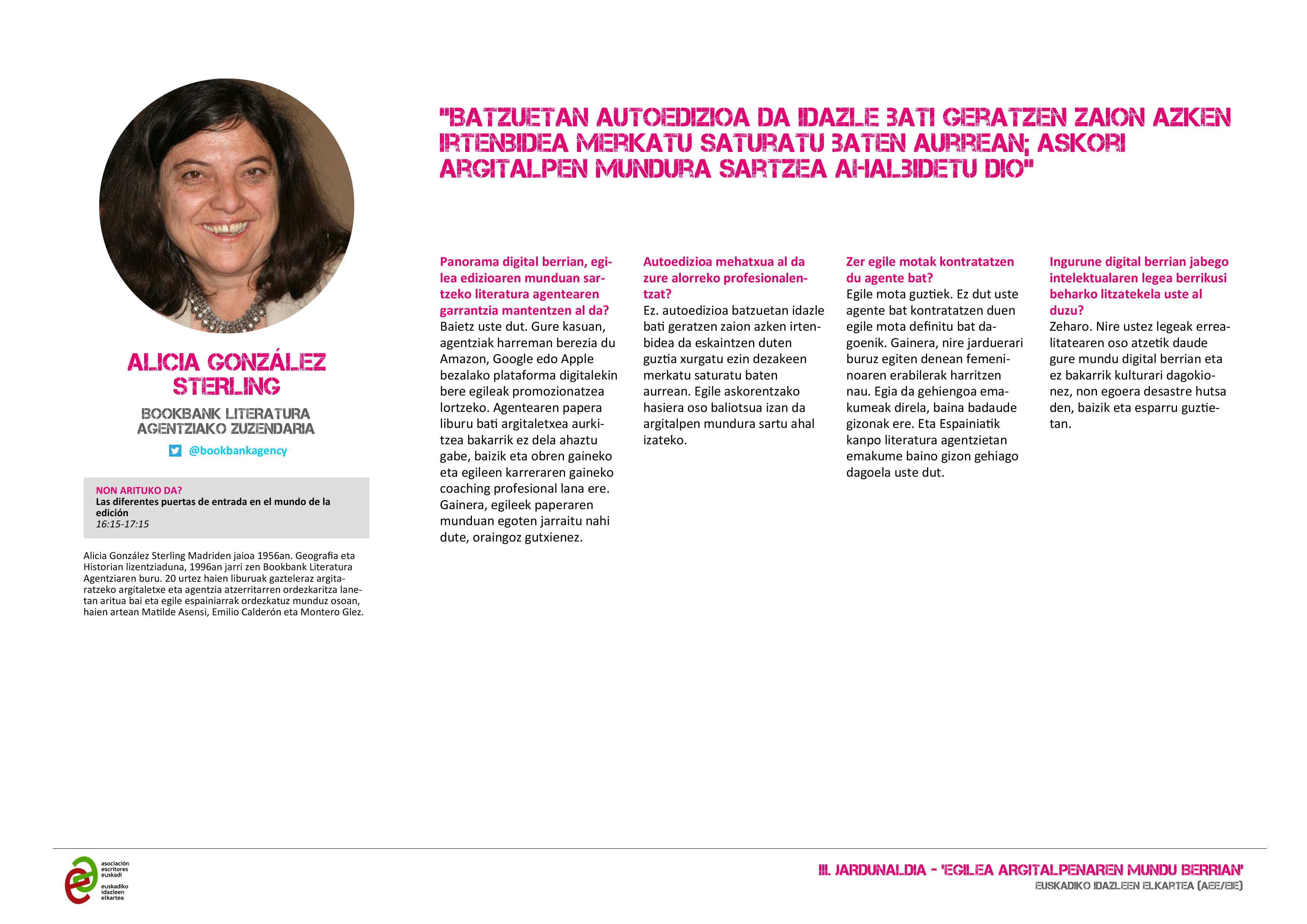 Atsegin handiz aurkezte ditugu ‘Egilea argitalpen mundu berrian’ III Jardunaldiko hizlariak, irailaren 16an egingo dena Bilboko Azkuna Zentroa-La Alhóndigan.