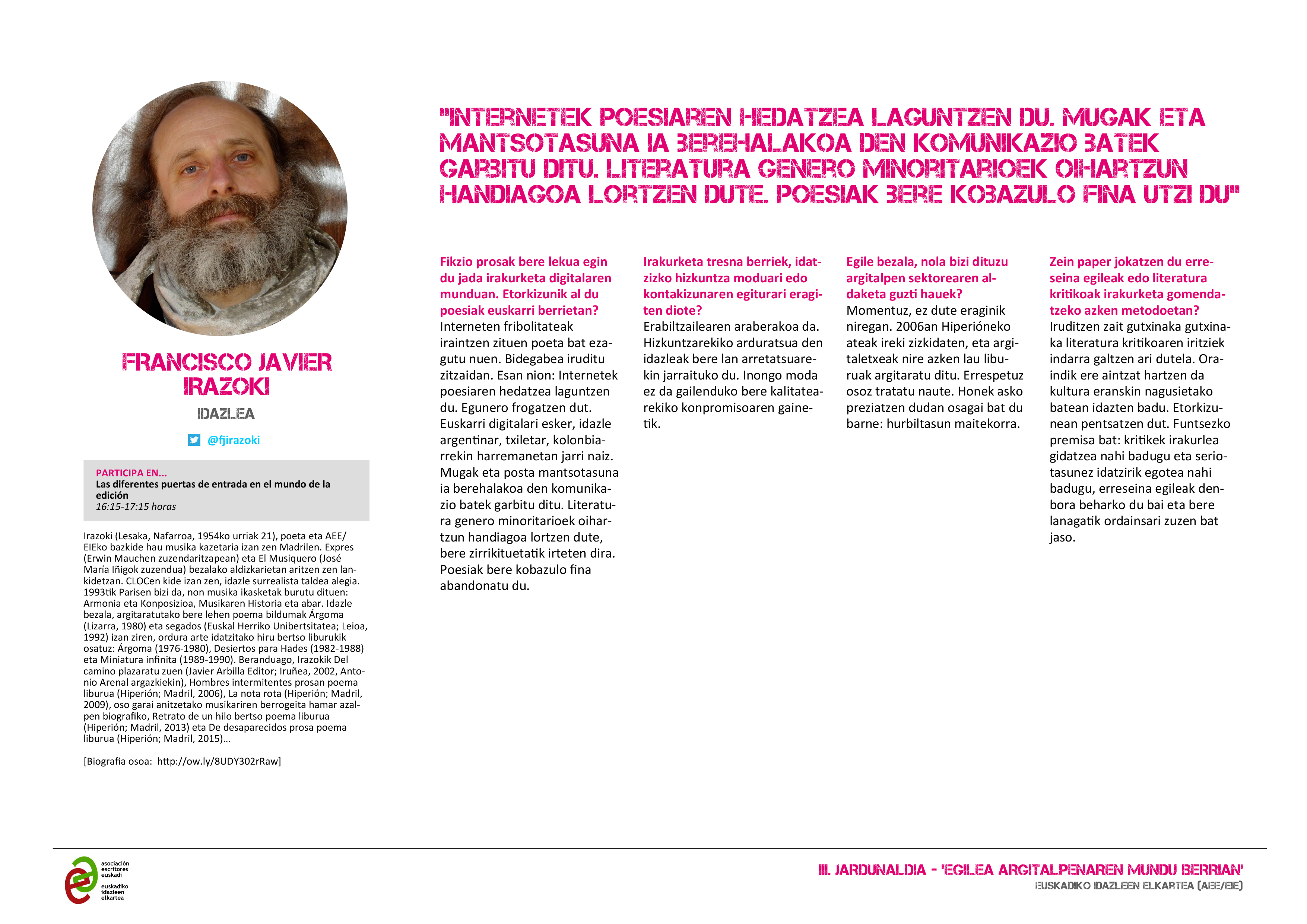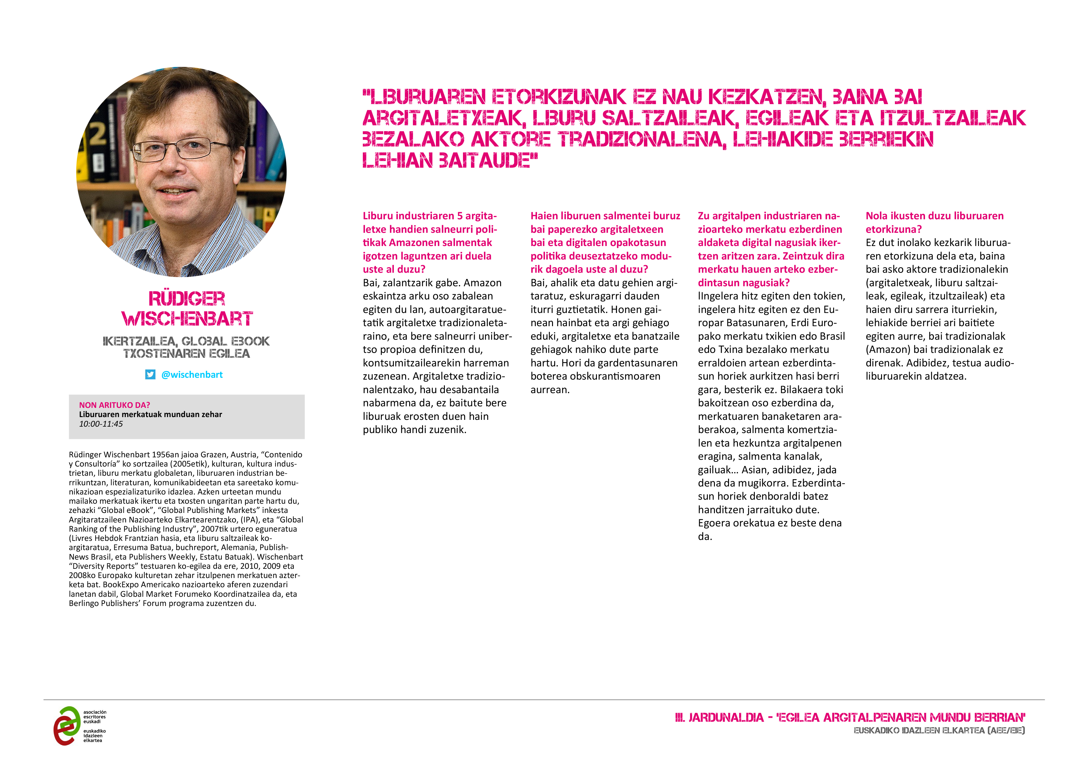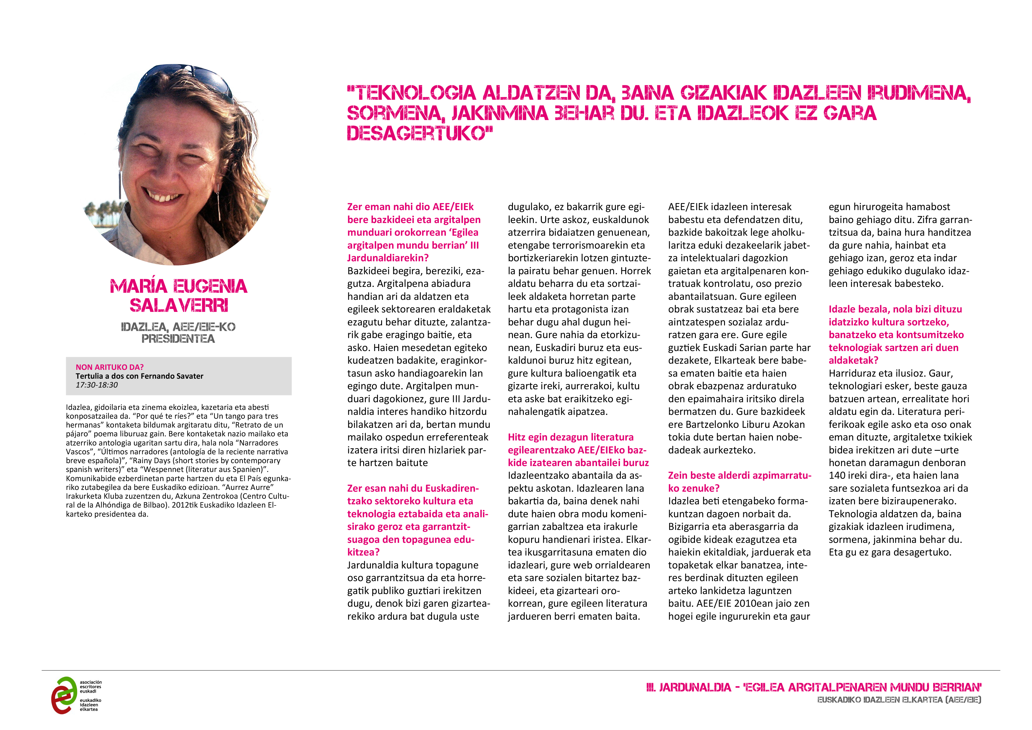 Atsegin handiz aurkezte ditugu ‘Egilea argitalpen mundu berrian’ III Jardunaldiko hizlariak, irailaren 16an egingo dena Bilboko Azkuna Zentroa-La Alhóndigan.