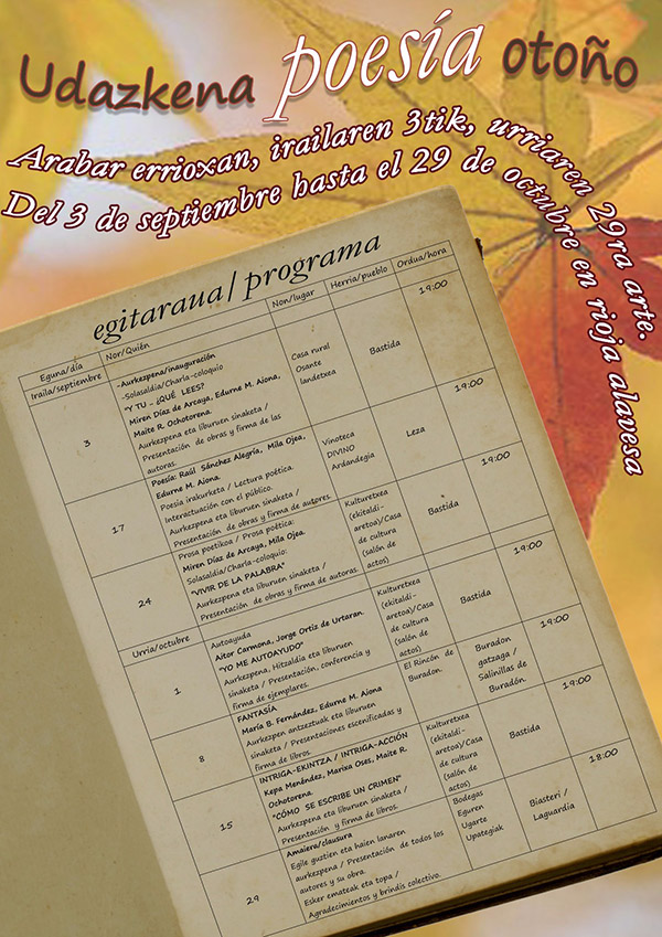 Edurne M. Aionak antolaturik, astean behin, larunbatetan, Arabako egileek literatura jardunaldietan parte hartuko dute (Hitzak-Palabras), Leza, Labastida, Laguardia eta Salinillas de Buradónen izango direlarik.