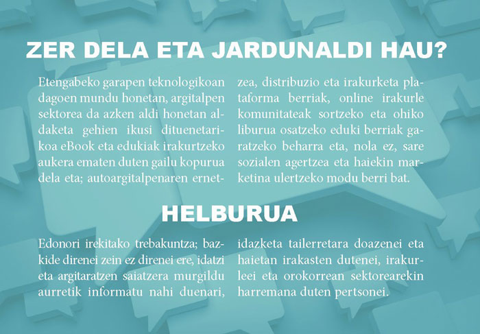 Idazketa eta argitalpenaren munduaren analisi zabala egiteko eta tartean dauden beste agente guztiek idazketa eta bere argitalpenetik eratorritako aukera eta onurak zehaztu ahal izateko helburuarekin hainbat iritzi eman ziren, hizlarien aldetik bai eta bertaratutako ikuslegoaren aldetik ere. Hemen hizlarien pentsaera ildo bakoitzaren barruan berrikuntza gehien zekartzatenak nabarmentzen ditugu.