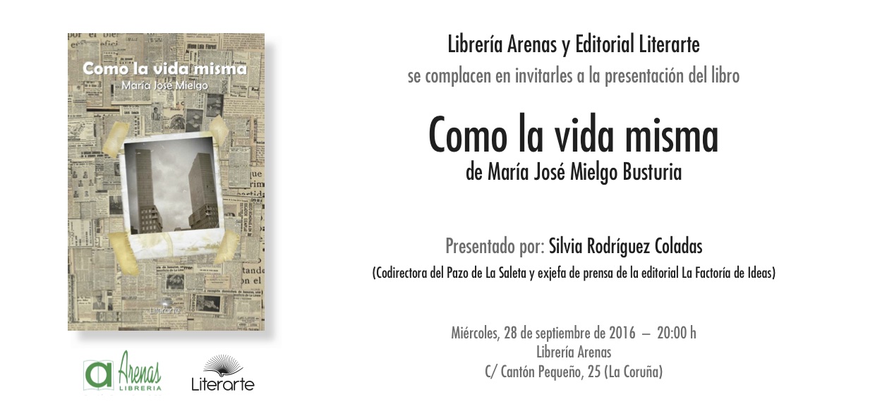 María José Mielgo os espera esta tarde, a partir de las 20:00 h., en la librería Arenas. Presenta su libro Como la vida misma, una colección de 37 relatos y microrrelatos "atrevidos, sin apósitos y que cuentan lo que pocos se atreven a decir", según palabras de la autora.