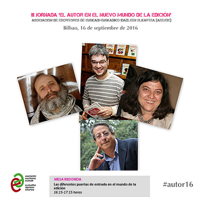 Bajo el título ‘Las diferentes puertas de entrada en el mundo de la edición', Alicia González Sterling (agente literaria BookBank), Fernando Tarancón (Editorial Astiberri) y Francisco Javier Irazoki (escritor) debatirán sobre el panorama al que se enfrenta hoy en día cualquier autor que desee estar presente en el mercado editorial. La mesa redonda será moderada por Antonio de Marco (Am Consultores), gran especialista en la gestión y promoción de ebooks. Tendrá lugar a primera hora de la tarde de la III Jornada 'El autor en el nuevo mundo de la edición' (Azkuna Zentroa-La Alhóndiga. Bilbao, 16/09/2016).