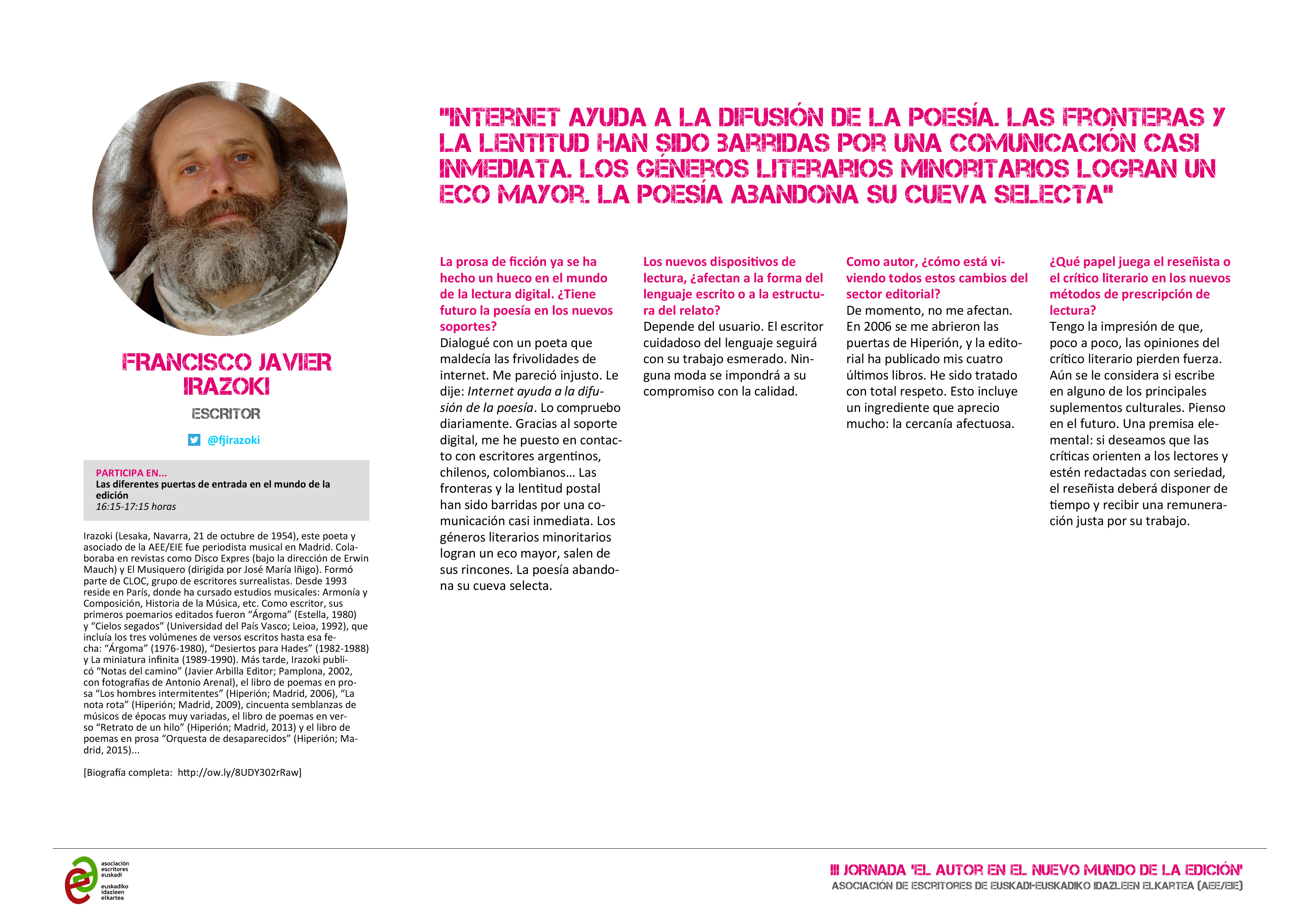 Entre las 13:15 y 14:00 horas del próximo 16 de septiembre Abel Amutxategi, Luis A. Bañeres, Adrián Martín Ceregido, Fernando G. Pañeda, Javier Gil, Cristina Gumuzio, Edurne M. Aiona, Gabriel Olamendi, Iñaki Sainz de Murieta, Garbiñe Salaberria y Jorge Urreta compartirán con los lectores todo aquello que deseen contar sobre sus libros.