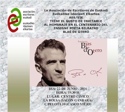 Desde la Asociación de Escritores de Euskadi-Euskadiko Idazleen Elkartea hemos querido sumarnos a los numerosos actos de homenaje que con motivo del centenario del nacimiento de Blas de Otero están teniendo lugar durante este año. Por ello hemos organizado en Bilbao un recital para el próximo miércoles 22 de junio a las 19:30 h. en el Salón Gambara del Centro Cívico 'La Bolsa'.