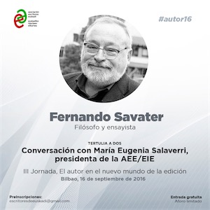Savater tomará parte en un cara a cara con la presidenta de la AEE/EIE, María Eugenia Salaverri. Programado para la sesión de la tarde, durante este tiempo de diálogo conversarán largo y tendido sobre los elementos claves que conforman el panorama actual del libro.