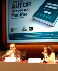 Imanol Agote (Viceconsejero de Cultura, Juventud y Deportes. Gobierno Vasco) y Elisa Yuste ( Consultora en cultura y lectura) participaron en esta charla dentro de la 2ª Jornada 'El autor en el nuevo mundo de la edición', organizada por la AEE/EIE y celebrada el 19 de septiembre en Bilbao. Imanol Agote hizo hincapié en las nuevas circunstancias que están viviendo las bibliotecas, que han pasado de la colección a la conexión, y lanzó un reto en esta era digital: “Vincular más estrechamente las bibliotecas públicas con las escolares”. Elisa Yuste, apuntó a que “los autoeditados tienen futuro en las bibliotecas con clubs de lectura que les den a conocer”. Y añadió que es importante que los bibliotecarios empiecen a dar a las personas que están al otro lado de la ventanilla el trato que se merece un usuario.
