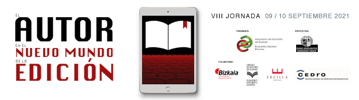 Esta jornada está organizada por la Asociación de Escritores de Euskadi/Euskadiko Idazleen Elkartea (AEE/EIE), con el apoyo del Departamento de Cultura del Gobierno Vasco y con la colaboración de la Biblioteca Foral de Bizkaia, del Gremio de Editores de Euskadi y de Cedro, a quienes agradecemos su constante contribución.