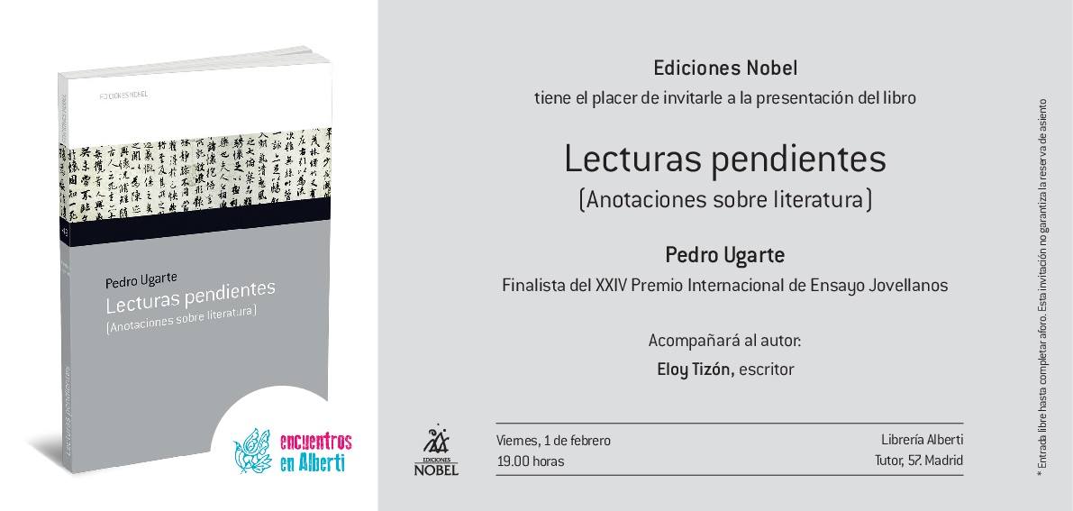 Tras su presentación por Bilbao y Vitoria, llega a Madrid lo último de Pedro Ugarte. El escritor y periodista bilbaíno protagonizará un nuevo mítico encuentro en Librería Alberti (Tutor, 57) a las 19:00 horas. Allí estará presentando Lecturas pendientes, que resultó finalista del XXIV Premio Internacional de Ensayo 'Jovellanos'. El autor estará acompañado por el también escritor, Eloy Tizón.