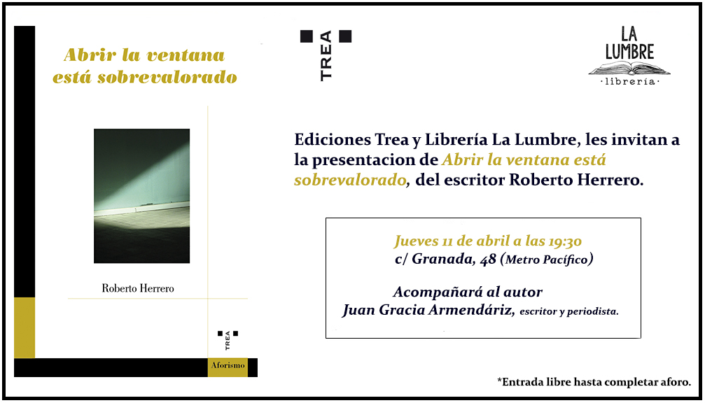 Tras su primera presentación en San Sebastián-Donostia, Roberto Herrero (San Sebastián, 1960) visita ahora Madrid para presentar su último libro Abrir la ventana está sobrevalorado (Trea, 2019). El encuentro será este jueves 11 de abril a las 19:30 horas, en la Librería La Lumbre (Granada, 48 Madrid) en compañía del escritor y periodista Juan Gracia Armendáriz.