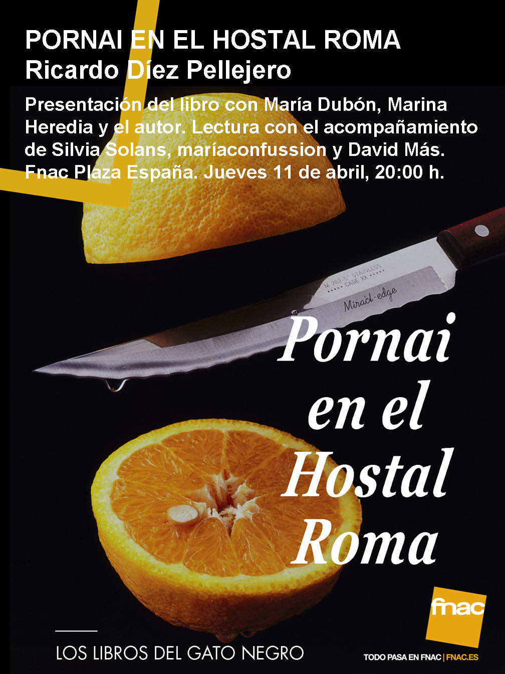 El próximo jueves 11 de abril, a las 20:00 horas, el escritor Ricardo Díez Pellejero presentará en la librería Fnac Plaza de España de Zaragoza (Coso, 25-27) Pornai en el Hostal Roma (Los libros del gato negro), que se encuentra a la venta desde este mes de abril. Acompañarán al autor, María Dubón y la editora Marina Heredia.