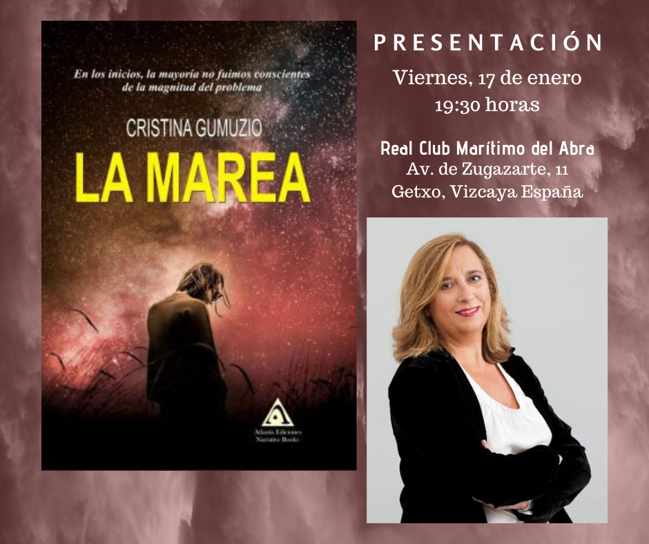 Cristina Gumuzio presenta su cuarta novela, La Marea (ediciones Atlantis), el próximo viernes 17 de enero. Será en el Real Club Marítimo del Abra en Las Arenas, Getxo (Av. de Zugazarte, 11) a las 19:30 h.