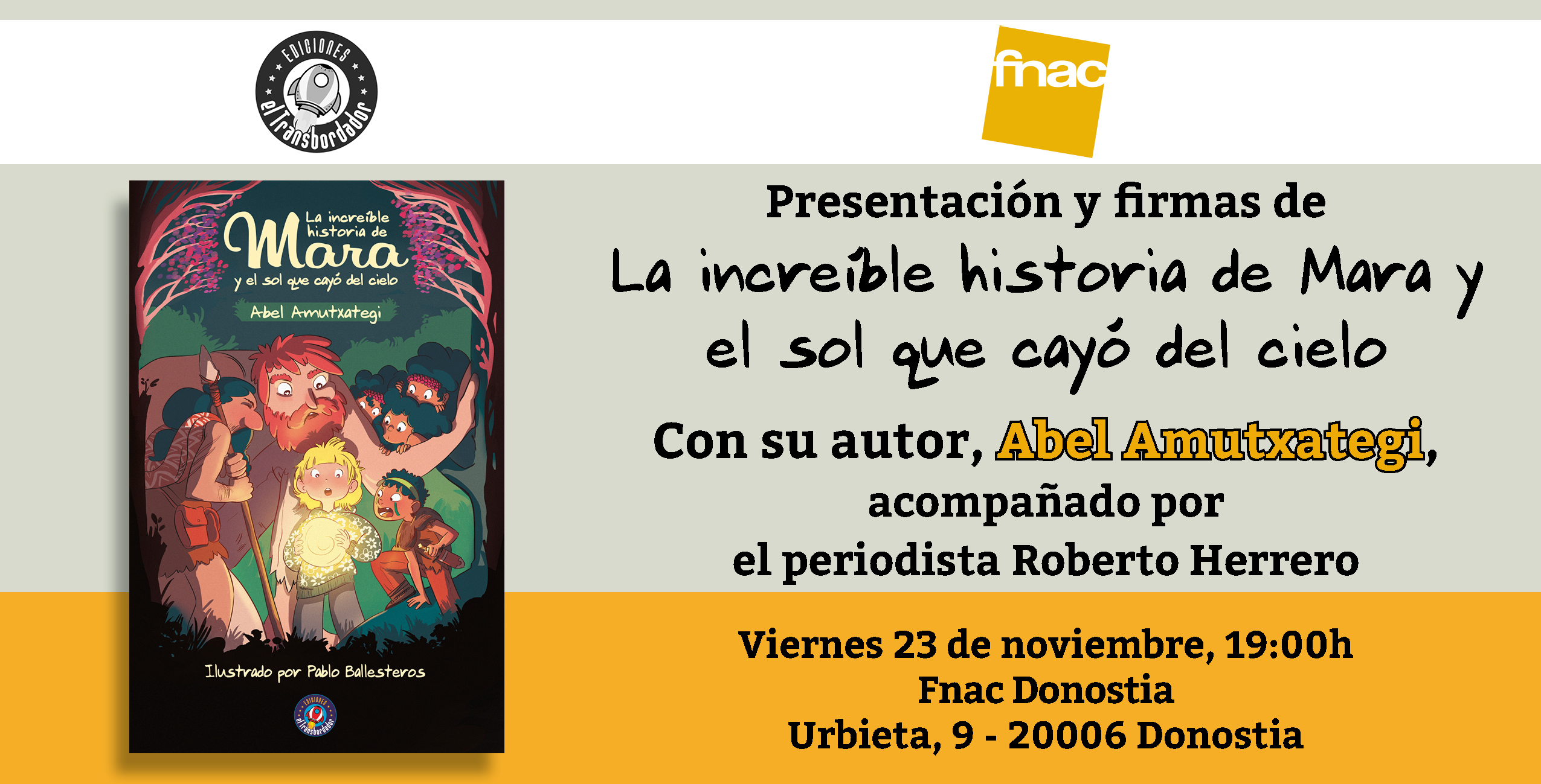Este viernes 23 de noviembre a partir de las 19:00h, FNAC Donostia acoge la presentación de La increíble historia de Mara y el sol que cayó del cielo, la última obra del escritor bilbaíno Abel Amutxategi. Le acompañará a esta cita, el también escritor y periodista Roberto Herrero.