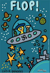Bere aurreko eleberrian, hots 'Bilbao, 1942 ¡No hay huevos!' lanean, bilbotar talde bat Amerika deskubritzera bidali eta gero, Luis A. Bañeresek XV. Mendea utzi eta etorkizunera jauzi egin du bere eleberri berriarekin; 'Flop!' izenburuko eleberrian bizkaitarrak aztertzeko misioa duen estralurtarra ekarriko du Bilbora